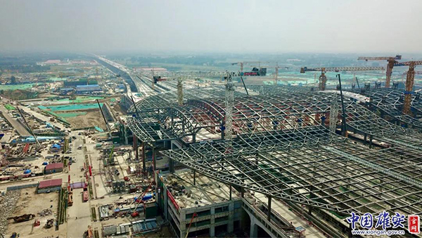 雄安站是京雄城际铁路规模最大的新建车站,位于距雄安新区起步区20公里的雄县城区东北部,建筑面积47.52万平方米,共13台23线(含新区轨道交通2台4线)。此次完工的钢结构屋盖覆盖整个京雄车场(含高架站房及两侧站台),由8块大跨度拱形箱梁拼装组成,总重量约25500吨,安装高度47米,共进行了1800余个吊次。此次钢结构屋盖封顶是继地下结构施工、地面混凝土主体施工后的又一重大工序。